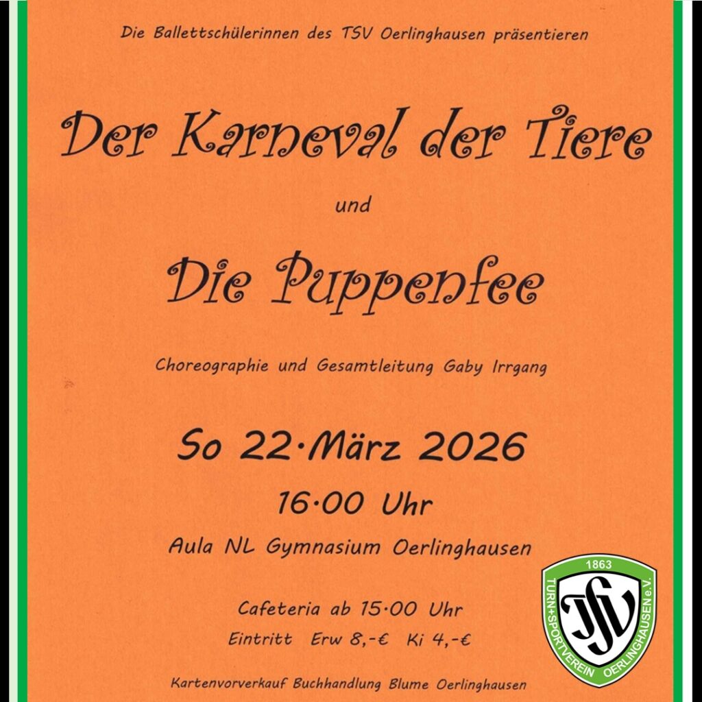 Die Ballettschülerinnen des TSV Oerlinghausen unter der Leitung von Gaby Irrgang laden ein zum „Karneval der Tiere“ & „Die Puppenfee“. Die Vorführung findet am Sonntag, den 22. März 2026 um 16 Uhr in der Aula des Niklas-Luhmann-Gymnasiums statt. Ab 15 Uhr ist die Cafeteria geöffnet. Karten zum Preis von 8 € für Erwachsene bzw. 4 […]