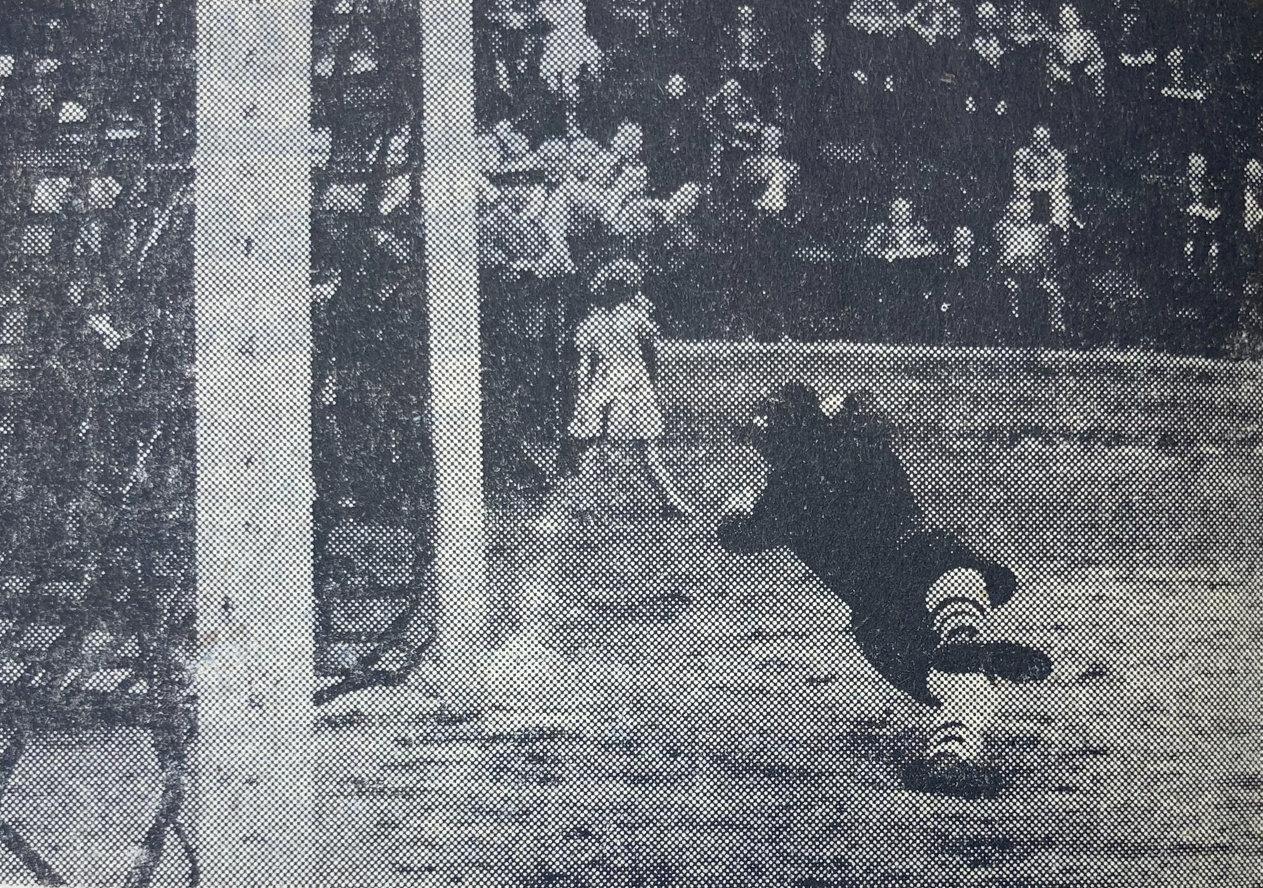Was nutzten den Hansestädtern 6:1 Ecken, zwei Lattenschüsse, die 1:0-Führung und zahlreiche Torchancen in beiden Halbzeiten – Oerlinghausens immer noch kreuzgefährlicher Standard-Linksaußen Großbongardt konnte sich zwar nur einmal der sonst großartigen Bewachung von Wicket entziehen, nutzte aber diese einmalige Chance in der 77. Minute hundertprozentig und lenkte den Ball seelenruhig über den vergeblich vorgelaufenen Trommer hinweg zum 1:2-Sieg des TSV Oerlinghausen in das verwaiste Lemgoer Tor.