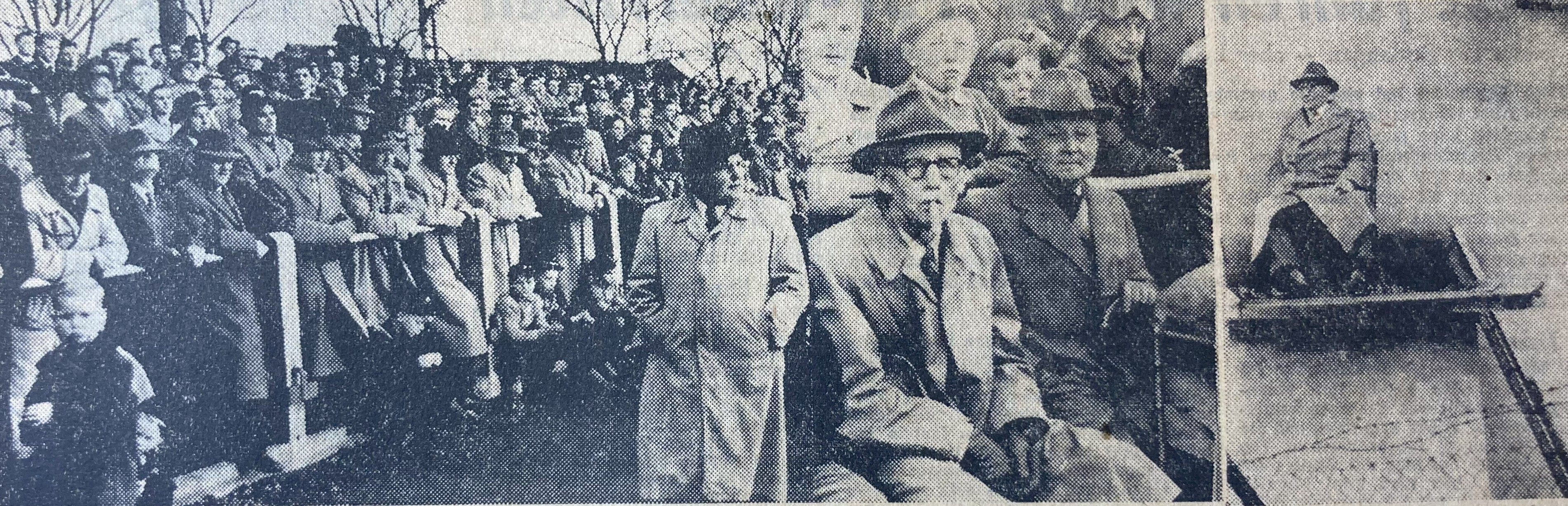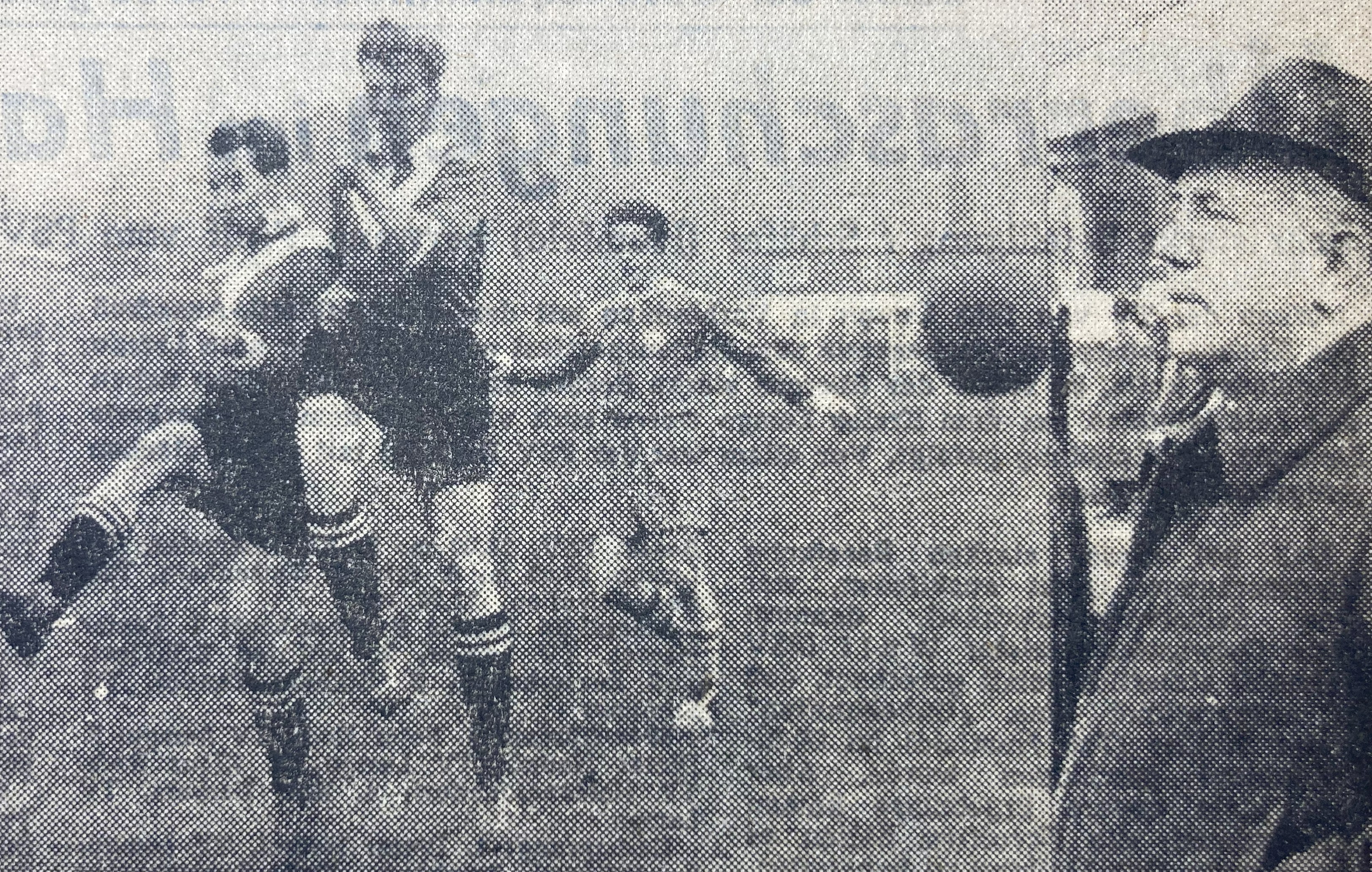 Das Schlagerspiel im Bild: Das Punktetreffen der Bergstädter gegen TBV Lemgo stand im Mittelpunkt des gestrigen Fußballgeschehens. Unser Fotograf „schoss“ folgende Aufnahmen: Jegodka schießt zum 1:0 ein. Ein Blick auf die Zuschauerkulisse. Ober erzielt den zweiten Treffer- und da kann natürlich Vereinsvorsitzender Brüntrup (Oerlinghausen) vergnügten Sinnes ins Wetter schauen. (Fotos: Freie Presse vom 01.04.1957)