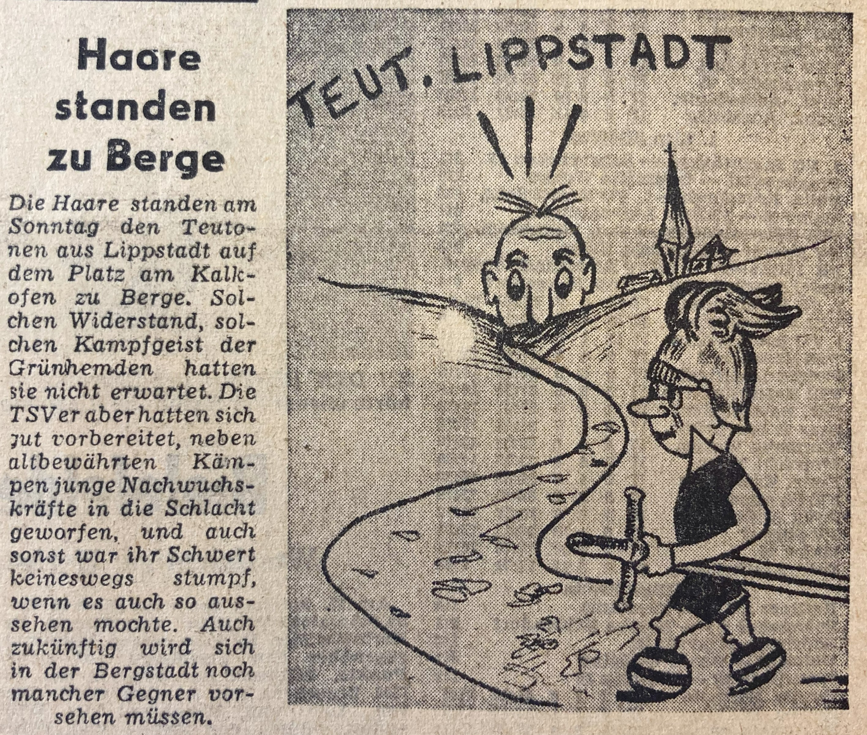 Die mit Wind beginnenden Bergstädter ließen platzierte Eckbälle und andere Torchancen ungenutzt und gerieten durch Eigentor von Sieveke (der einen eigenen Abwehrspieler abschoss!) 0:1 in Rückstand, die Strate zu Beginn der zweiten Halbzeit (48. Min.) – als Stopper Strotha angeschlagen war und nur noch eine Statistenrolle spielte – mit platziertem Schuss in die rechte Ecke ausglich. Zuvor hatten Büker, Schulz und Nebenstürmer wiederholt knapp das Lippstädter Tor verfehlt und Becker insofern Glück, als ein Eckball knapp am Pfosten vorbeistrich! Rechtsaußen Ebert (50. Min., einer der besten Spieler auf dem Feld) und Mittelstürmer Heiler (75. u. 83. Min.) erhöhten für „Teutonia“ Lippstadt trotz großartiger Abwehrparaden von Becker auf 4:1, ehe Schulz einen Alleingang mit dem zweiten Gegentor für TSV Oerlinghausen (85. Min.) krönte. Am verdienten Sieg der „Teutonen“ über die gestern äußerst schwachen (da übernervösen) Bergstädter war nichts mehr zu ändern ...