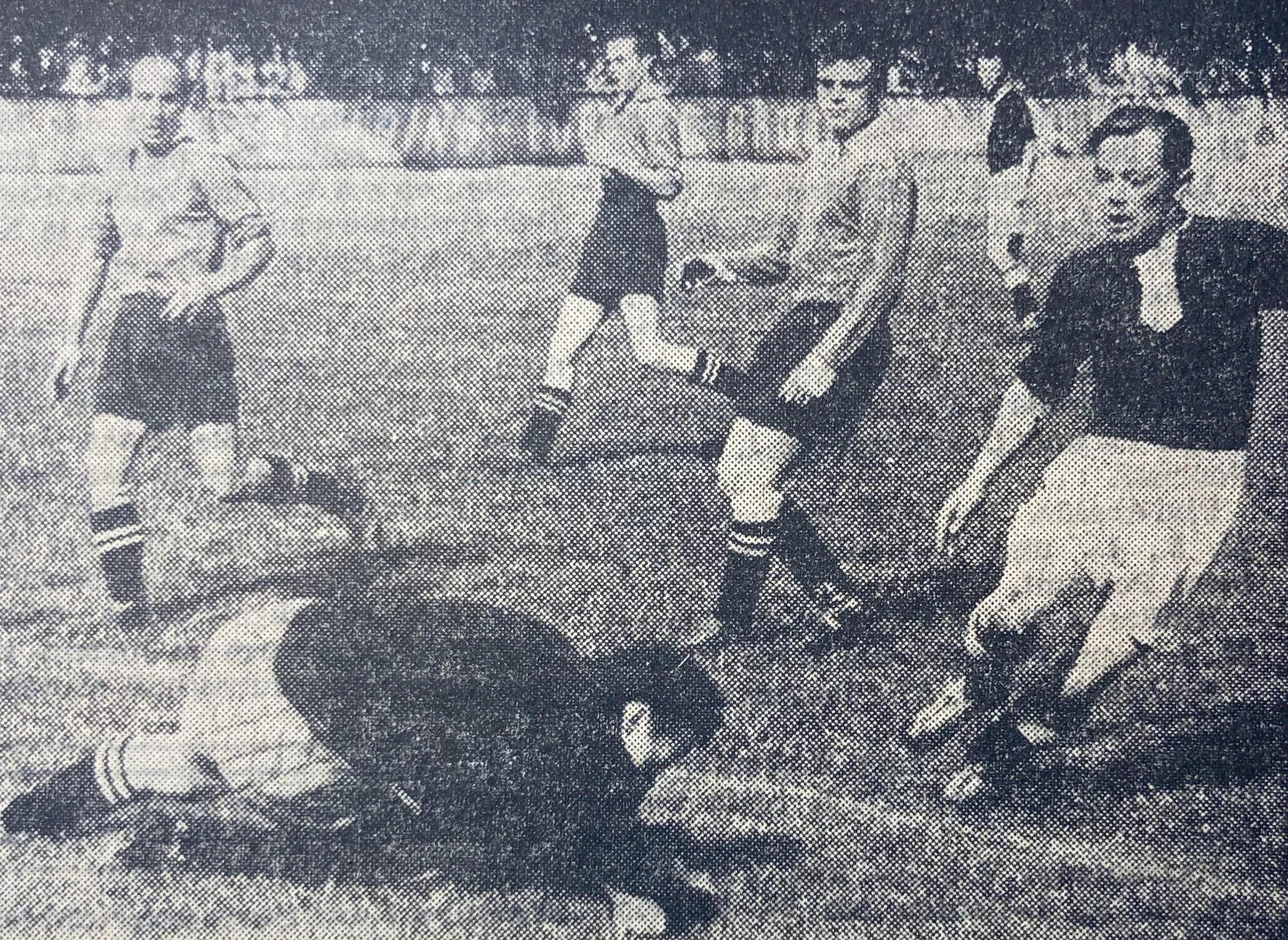 Im Spiel Teutonia Lippstadt – Oerlinghausen gewannen die Lippstädter verdient. Die Oerlinghauser Hintermannschaft darf sich bei ihrem prächtigen Torwart bedanken, dass die Niederlage nur knapp ausfiel. Unser Bild: Abwehraktion des Oerlinghauser Torstehers (Foto: LR/Ino von Neander vom 27.05.1957)